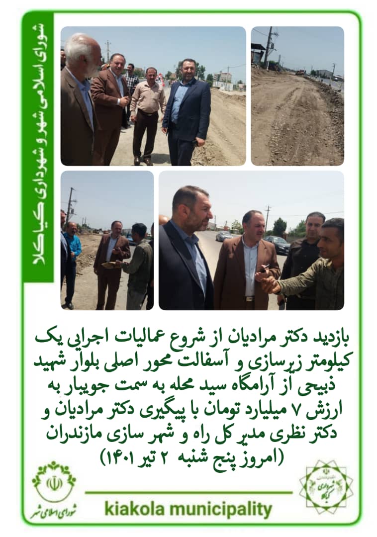 بازدید دکتر مرادیان از شروع عمالیات اجرایی یک کیلومتر زیرسازی و آسفالت محور اصلی بلوار شهید ذبیحی از آرامگاه سید محله به سمت جویبار به ارزش ۷ میلیارد تومان با پیگیری دکتر مرادیان و دکتر نظری مدیر کل راه و شهر سازی مازندران