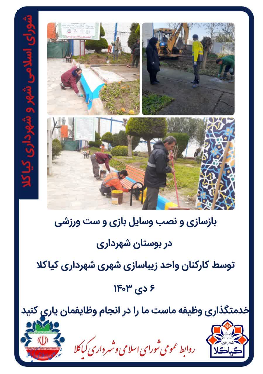 بازسازی و نصب وسایل بازی و ست ورزشی در بوستان شهرداری 1403/11/02 بازسازی و نصب وسایل بازی و ست ورزشی در بوستان شهرداری دسته بندی اخبار مدیریت پسماند (0) فرهنگی،اجتماعی و ورزشی (1) شهرداری منطقه یک (0) شهرداری منطقه 2 (0) شهرداری (118) سیما، منظر و فضای سبز شهری (3) ساماندهی مشاغل و فرآورده های کشاورزی (0) سازمان مدیریت حمل و نقل بار و مسافر (0) سازمان عمران و باز آفرینی فضای شهری (0) آرامستان (0) آتش نشانی و خدمات ایمنی (0)