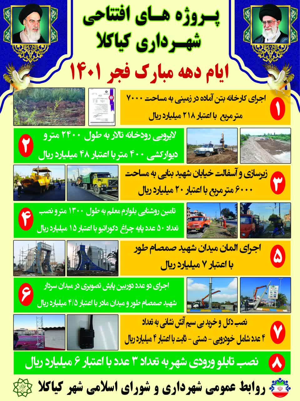 پروژه های افتتاحی شهرداری کیاکلا - ایام دهه مبارک فجر 1401 1401/12/07 دسته بندی اخبار مدیریت پسماند (0) فرهنگی،اجتماعی و ورزشی (1) شهرداری منطقه یک (0) شهرداری منطقه 2 (0) شهرداری (118) سیما، منظر و فضای سبز شهری (3) ساماندهی مشاغل و فرآورده های کشاورزی (0) سازمان مدیریت حمل و نقل بار و مسافر (0) سازمان عمران و باز آفرینی فضای شهری (0) آرامستان (0) آتش نشانی و خدمات ایمنی (0)