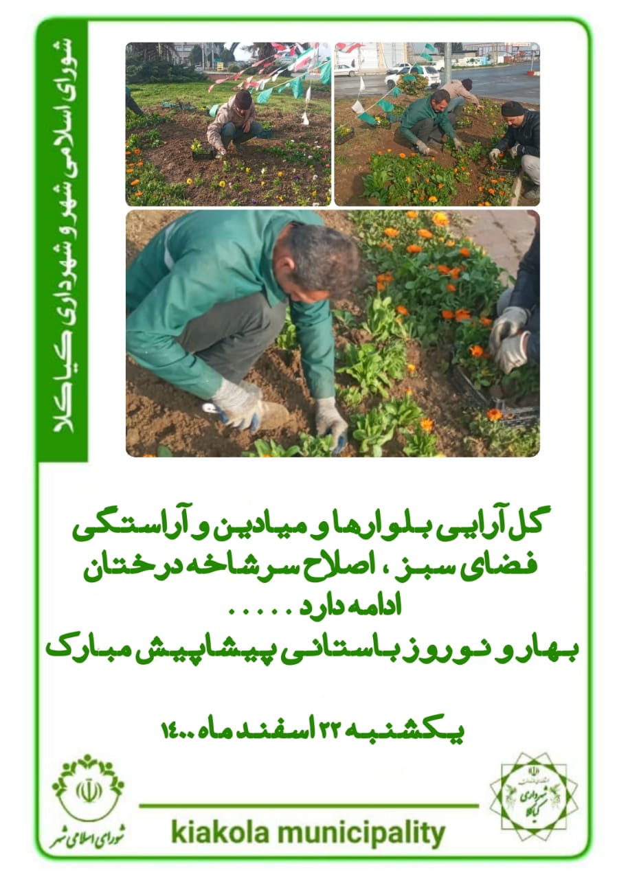 گل آرایی بلوارها و میادین ، آراستگی فضای سبز ، اصلاح سرشاخه درختان .... 1401/01/11 گل آرایی بلوارها و میادین ، آراستگی فضای سبز ، اصلاح سرشاخه درختان ....1400/12/22 دسته بندی اخبار مدیریت پسماند (0) فرهنگی،اجتماعی و ورزشی (1) شهرداری منطقه یک (0) شهرداری منطقه 2 (0) شهرداری (118) سیما، منظر و فضای سبز شهری (3) ساماندهی مشاغل و فرآورده های کشاورزی (0) سازمان مدیریت حمل و نقل بار و مسافر (0) سازمان عمران و باز آفرینی فضای شهری (0) آرامستان (0) آتش نشانی و خدمات ایمنی (0)