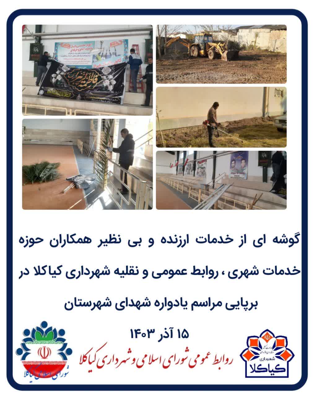 گوشه ای از خدمات ارزنده و بی نظیر همکاران حوزه خدمات شهری ، روابط عمومی و نقلیه شهرداری کیاکلا در برپایی مراسم یادواره شهدای شهرستان